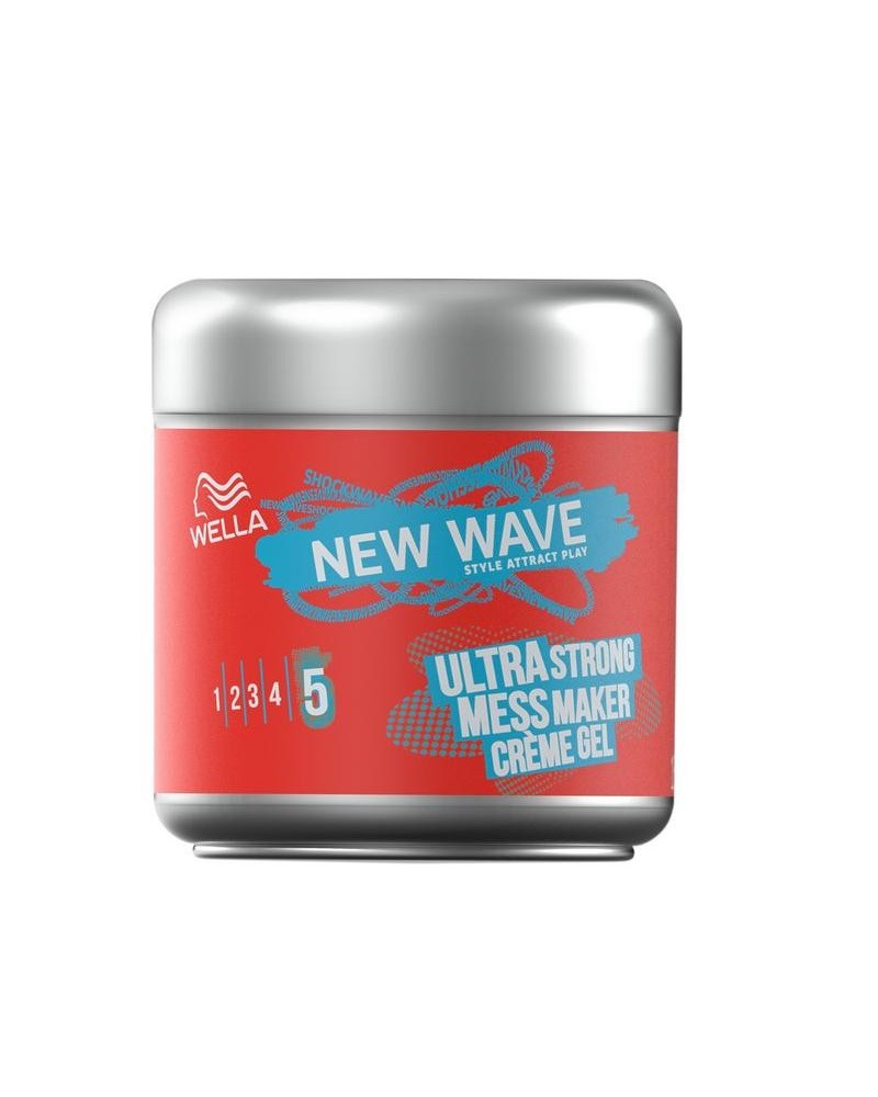 Wella New Wave Ultra Strong Mess Maker Crème Gel 150ML is een langhoudende haarstyling gel die het haar glans geeft. Deze Crème Gel is ook geweldig voor het creëren van een messy look. Bereik langdurige extra sterke fixatie en kracht met de Mess Maker Crème Hair Gel terwijl je een messy, herwerkbare textuur toevoegt. De haargel is perfect voor kortere kapsels om een edgy messy look te creëren.