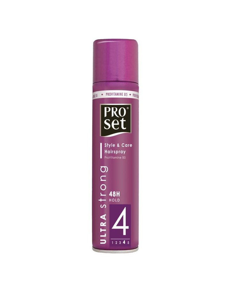 ProSet Hairspray Ultra Strong is geschikt voor kapsels die een stevige ondersteuning nodig hebben waardoor het haar de hele dag op z’n plaats blijft. De ProSet hairsprays bevatten extra veel Pro Vitamine B5, welke zorgt voor extra glans. ProSet Hairspray Ultra Strong geeft je haar extra volume, en heeft fixatiekracht 4.