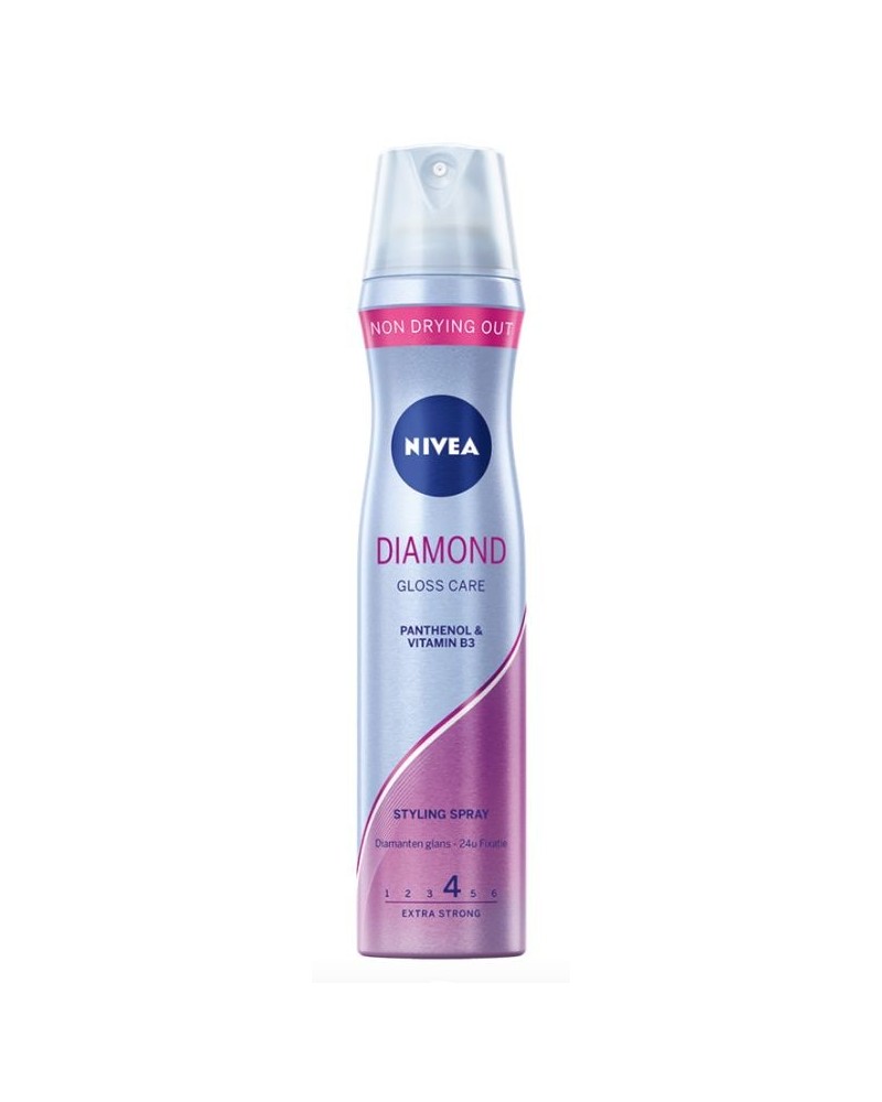 NIVEA Diamond Gloss Care Styling Spray 250ml voor diamanten glans en extra sterke fixatie. Voor extra volume van het haar, van de wortel tot de punten terwijl het natuurlijkzacht blijft aanvoelen. De innovatieve formule met Panthenol en Vitamine B3 versterkt en beschermt het haar. Droogt niet uit, voor mooi gestyled haar.