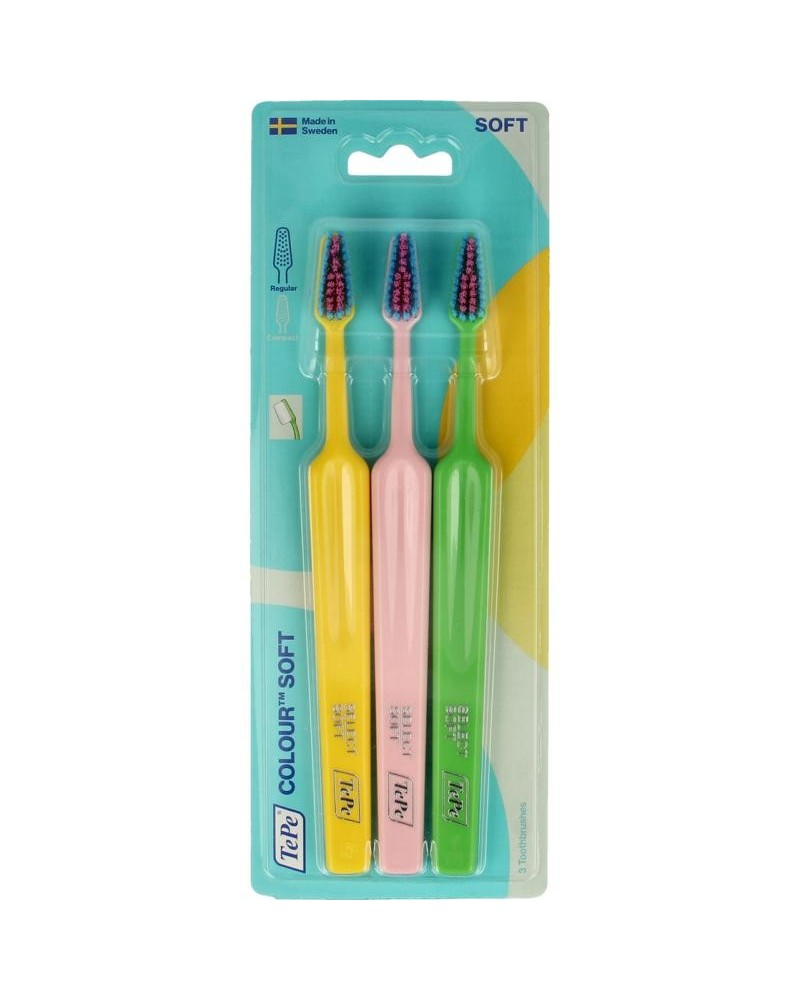 De TePe Colour™ Soft is een gebruiksvriendelijke tandenborstel van TePe, ontwikkeld in samenwerking met tandheelkundige experts voor een efficiënte en zachte tandplakverwijdering. De taps toelopende borstelkop verbetert de toegang en de afgeronde filamenten zorgen voor een zachte reiniging. Verwarm de hals van de TePe Colour™ Soft met heet water om deze te buigen. De TePe Colour™ Soft is beschikbaar met roze, groene of turquoise filamenten en zes verschillende handvatkleuren.