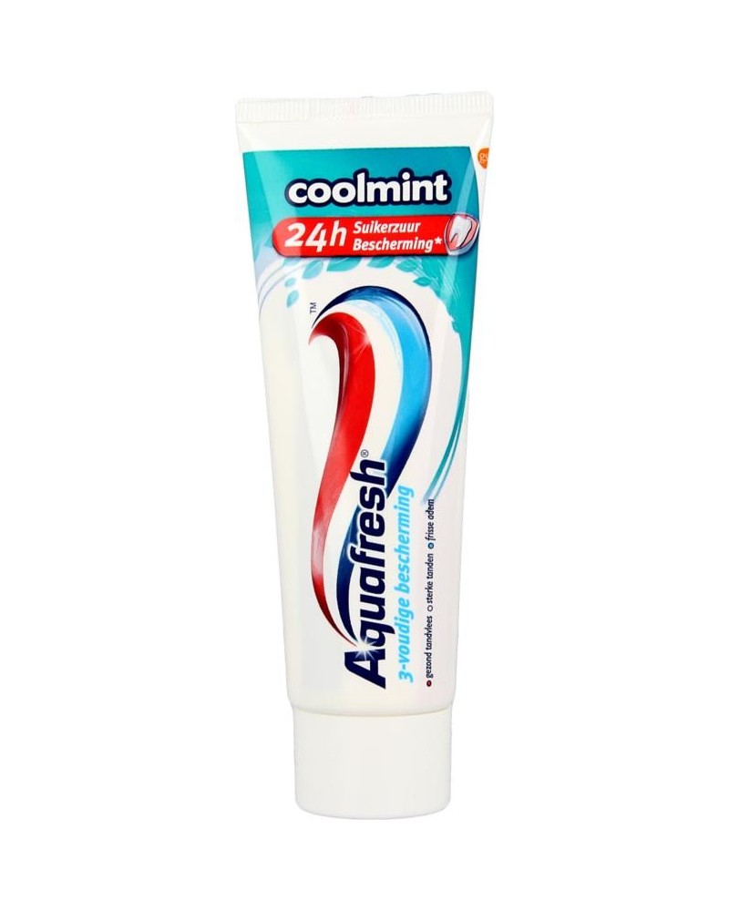 Aquafresh Cool Mint tandpasta met de vertrouwde 3-voudige bescherming tandpasta heeft een frisse smaak op basis van natuurlijke kruiden en Suikerzuur Bescherming*, die dankzij fluoride beschermt tegen suikerzuur in tandplak, de belangrijkste oorzaak van gaatjes. Het helpt vitale mineralen in te sluiten en beschermen. Gaatjes ontstaan als suikers in voeding en drankjes door tandplak worden omgezet in zuren die de tanden verzwakken. Houd je mond gezond met de vertrouwde 3-voudige bescherming van Aquafresh: gezond tandvlees, sterke tanden, frisse adem.