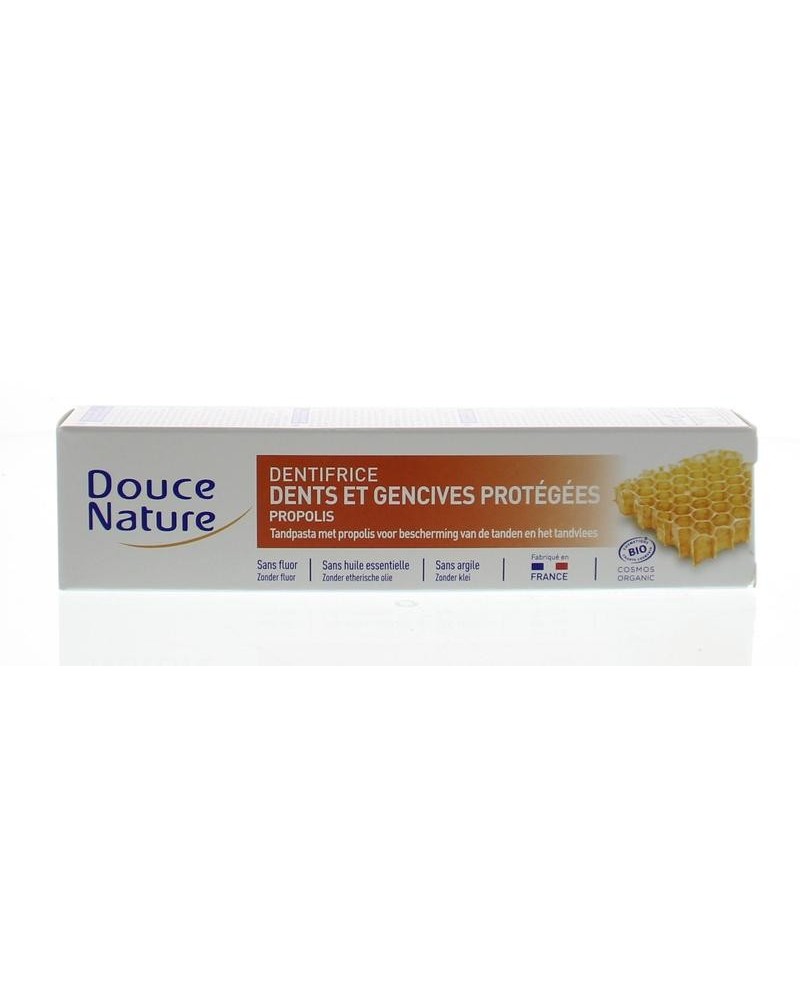 Douce Nature tandpasta met propolisextract voor de bescherming van tanden en tandvlees is fluoridevrij en vrij van sulfaten.