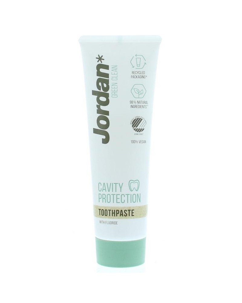 Jordan Green Clean Caries Protection tandpasta is een milde maar zeer effectieve tandpasta en bevat de aanbevolen hoeveelheid fluoride en 10% Xylitol. Xylitol is een natuurlijke zoetstof gewonnen uit berkenhout. In combinatie met fluoride geeft het sterkere tanden en biedt het superieure bescherming tegen tandplak en gaatjes. Jordan Green Clean Caries Protection tandpasta bestaat voor 98% uit natuurlijke ingrediënten die zorgvuldig zijn geselecteerd. De verpakking is gemaakt van gerecycled voedselveilig plastic - waardoor het een tweede leven krijgt. De tandpasta is geschikt voor volwassenen.