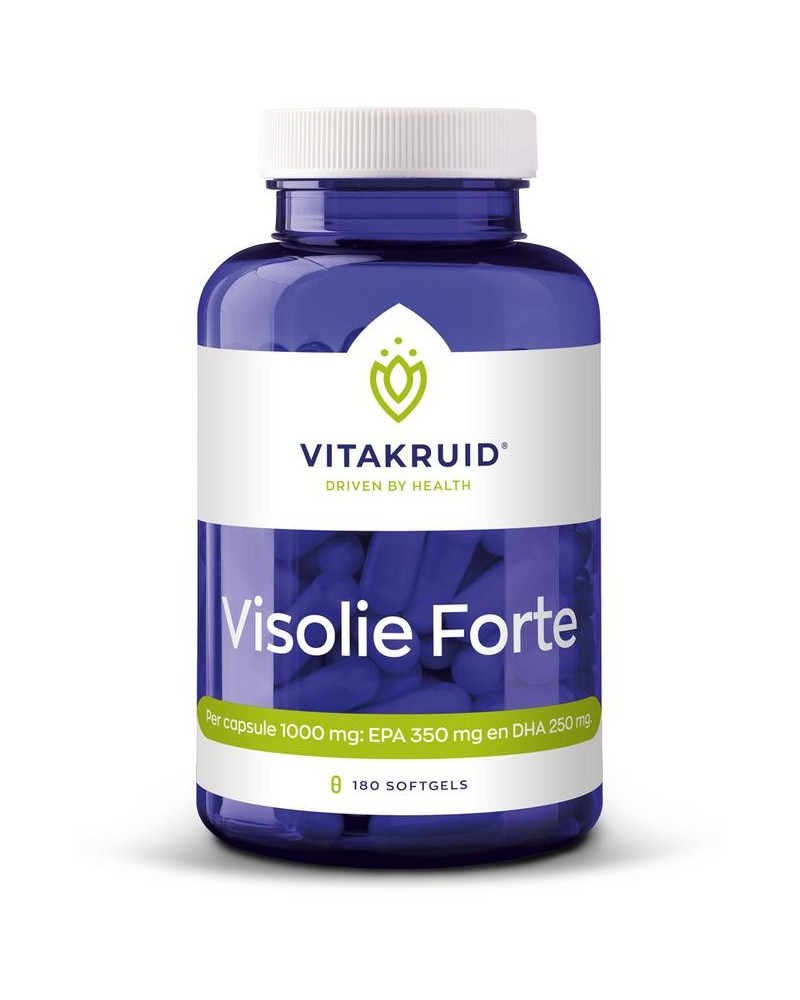 Onze voeding laat vaak een tekort aan Omega-3 vetzuren zien. De laatste 20 jaar is in onze voeding veel aandacht besteed aan de Omega-6 vetzuren (plantaardige oliën en margarines). Verhoudingsgewijs wordt er onvoldoende Omega-3 vetzuren geconsumeerd ten opzichte van Omega-6 vetzuren waardoor de eicosanoïden (EPA) balans wordt verstoord. Onder invloed van de goede visolie blijkt het vetspectrum te wijzigen. Het regelmatig gebruiken van Omega-3 vetzuren, net als andere macronutriënten is voor aanstaande moeders van belang. Visolie forte van Vitakruid bevat 1000 mg visolieconcentraat per capsule en voorziet in een EPA van 350 mg en DHA van 250 mg. Deze uitzonderlijke kwaliteit voldoet aan de allerhoogste eisen van stabiliteit en zuiverheid.
