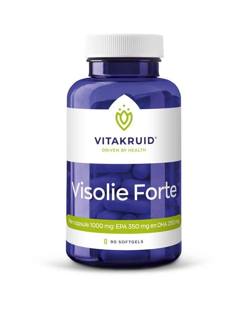 Onze voeding laat vaak een tekort aan Omega-3 vetzuren zien. De laatste 20 jaar is in onze voeding veel aandacht besteed aan de Omega-6 vetzuren (plantaardige oliën en margarines). Verhoudingsgewijs wordt er onvoldoende Omega-3 vetzuren geconsumeerd ten opzichte van Omega-6 vetzuren waardoor de eicosanoïden (EPA) balans wordt verstoord. Onder invloed van de goede visolie blijkt het vetspectrum te wijzigen. Het regelmatig gebruiken van Omega-3 vetzuren, net als andere macronutriënten is voor aanstaande moeders van belang. Visolie forte van Vitakruid bevat 1000 mg visolieconcentraat per capsule en voorziet in een EPA van 350 mg en DHA van 250 mg. Deze uitzonderlijke kwaliteit voldoet aan de allerhoogste eisen van stabiliteit en zuiverheid.