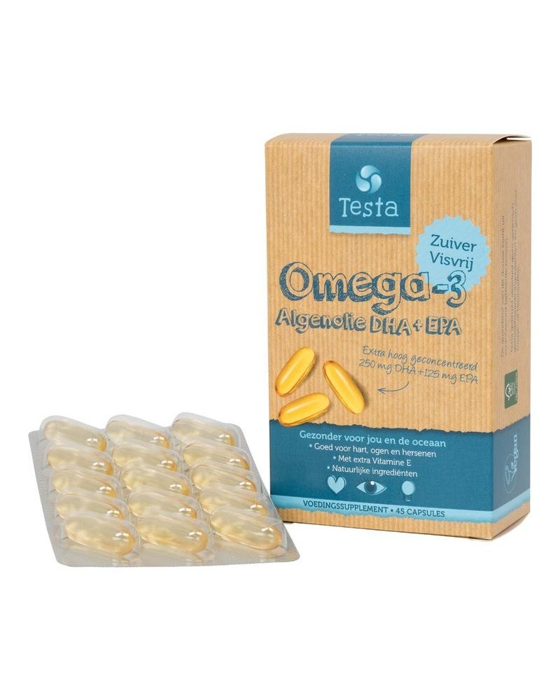 Testa Omega 3 is een hoogwaardig, 100% plantaardig Omega-3 supplement. Testa is zuiverder dan visolie en bedoeld om visolie te vervangen en ook geschikt voor vegetariërs en veganisten. Bovendien worden de capsules gemaakt van zeewierextract. Algenolie bevat geen verontreinigingen, zoals in visolie kunnen voorkomen. Testa Omega-3 DHA+EPA bevat 485 mg Omega-3 vetzuren per capsule, waarvan minimaal 300 mg DHA en 150 mg EPA.