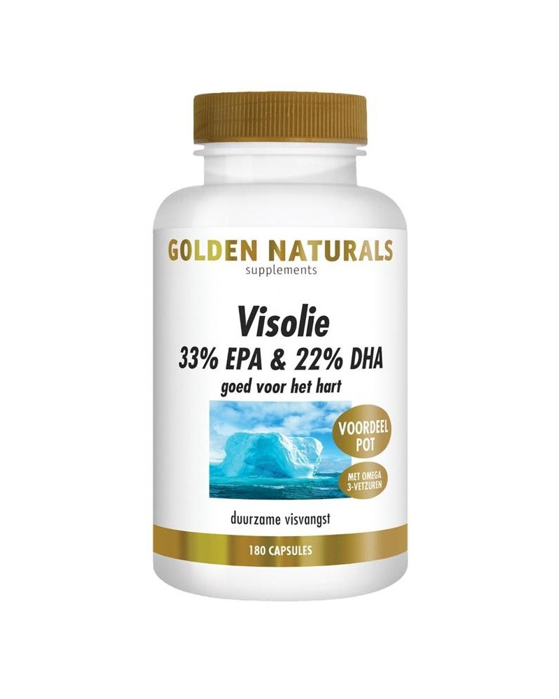 Vette vis is een rijke bron van omega-3 vetzuren EPA en DHA. Golden Naturals Visolie capsules bevatten een zuivere, kwalitatieve visolie afkomstig van ansjovis uit de Stille Oceaan die duurzaam en onder gecontroleerde omstandigheden is gevangen. Golden Naturals Visolie EPA 33% / DHA 22% is rijk aan omega-3 vetzuren met een ruime dosering EPA en DHA. Daarnaast bevat het vitamine E.