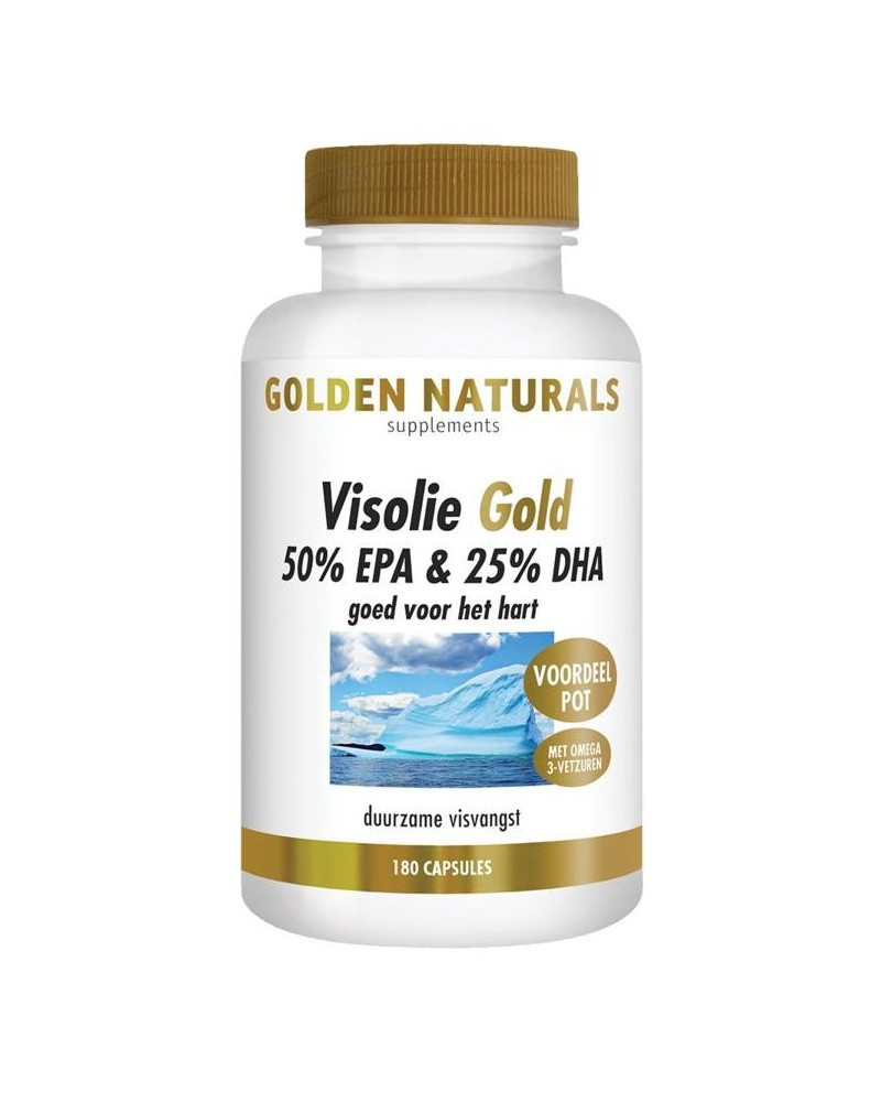 Vette vis is een rijke bron van omega-3 vetzuren EPA en DHA. Golden Naturals Visolie capsules bevatten een zuivere, kwalitatieve visolie afkomstig van ansjovis uit de Stille Oceaan die duurzaam en onder gecontroleerde omstandigheden is gevangen. Golden Naturals Visolie EPA 50% / DHA 25% is rijk aan omega-3 vetzuren met een hoge dosering EPA en DHA.