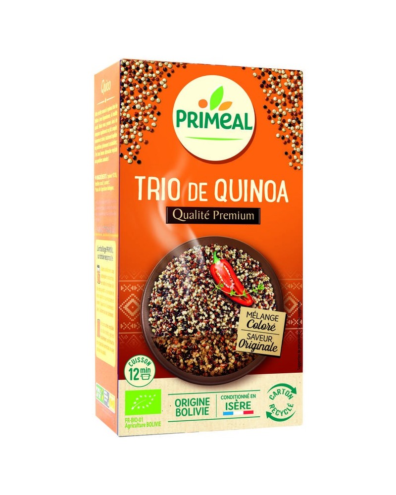 Priméal is sinds 1989 een quinoa pionier en heeft deze echte quinoa geselecteerd om zijn eersteklas kwaliteit en onnavolgbare smaak. Priméal Quinoa Trio is een combinatie van echte witte quinoa, bekend om zijn zachte smaak en zachte textuur, echte rode quinoa, met een stevigere textuur en mooie rode kleur, en echte zwarte quinoa, met een meer rustieke smaak en knapperige textuur. Quinoa is een bron van proteïnen en vezels.