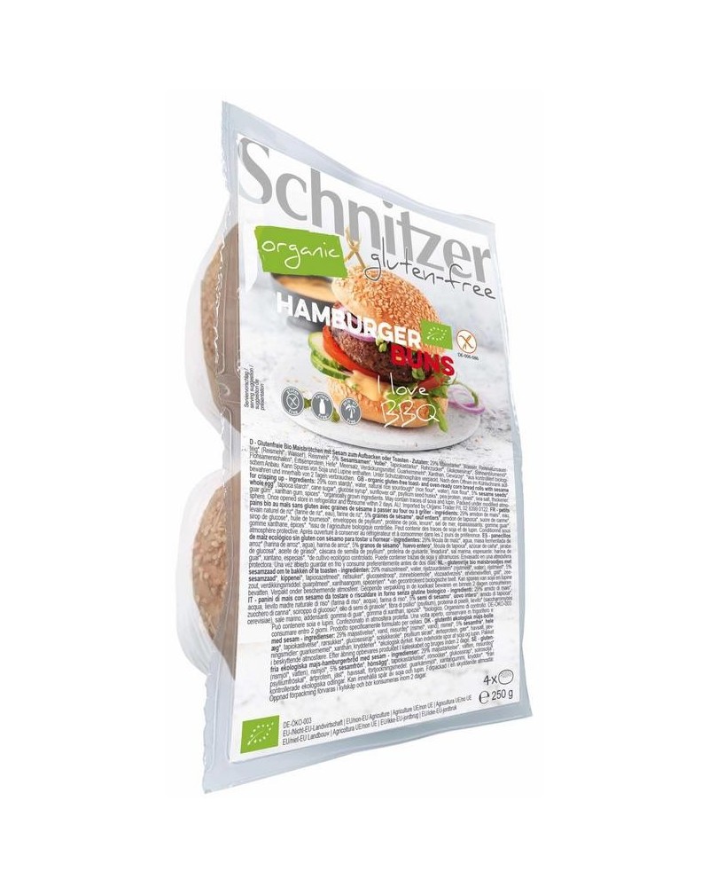 Glutenvrij biologisch hamburgerbroodje om heerlijke hamburgers mee te maken. Voor gebruik even roosteren in oven of broodrooster. 4 stuks per verpakking.