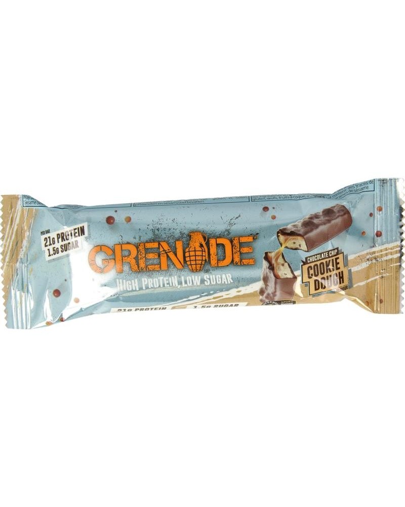 Eiwitreep met koekjesdeegsmaak met chocoladeschilfers in melkchocolade met zoetstoffen.