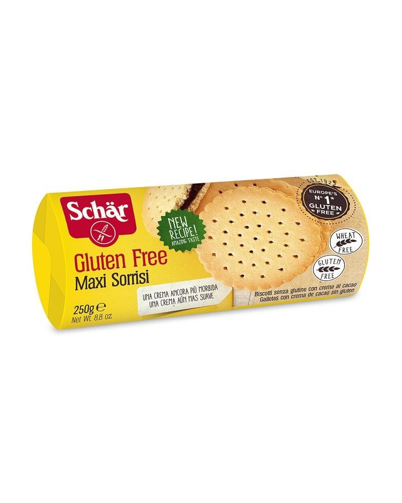 Maxi Sorrisi van Schär. Glutenvrije biscuit koekjes met cacaocrème vulling ertussen. Heerlijk smaakvol en lekker bij koffie of thee.