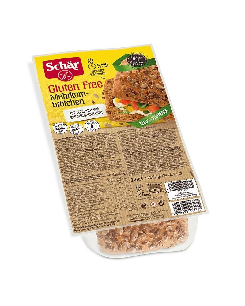 Glutenvrije meergranen broodjes van Schär. Even 5 minuten afbakken, en dan genieten maar! Per 4 stuks verpakt.
