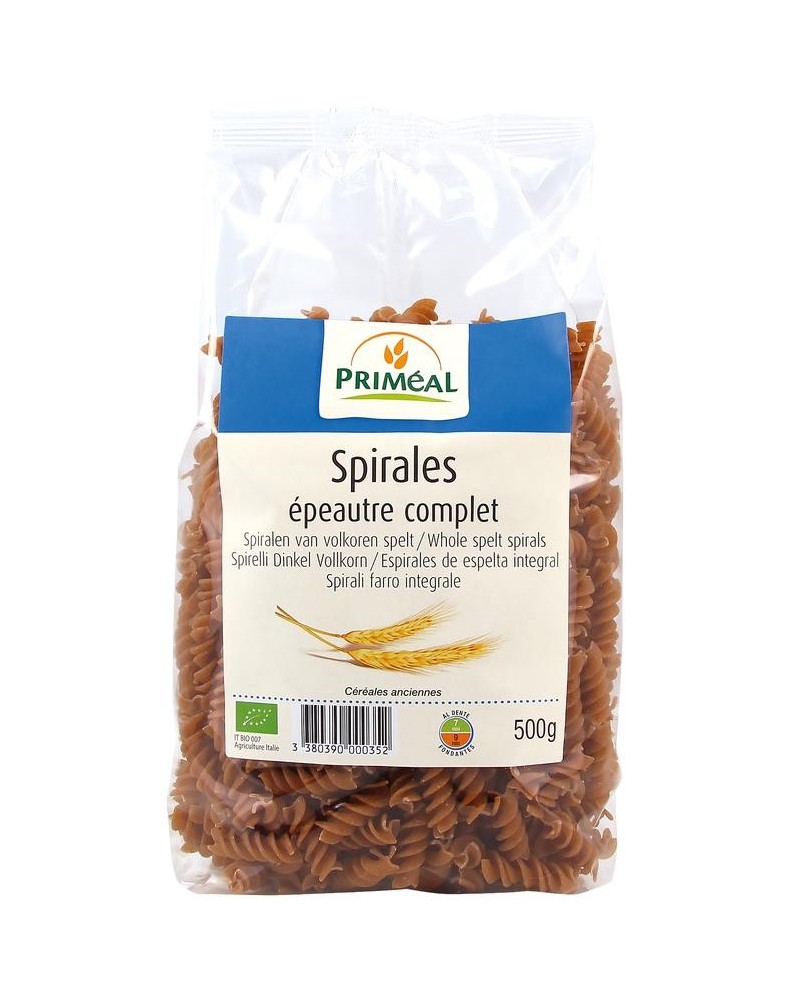 Spelt is een oud graan dat oorspronkelijk uit het Midden-Oosten komt. Het geeft je pastagerechten een originele smaak. De biologische Primeal Fusilli spiralen van volkoren spelttarwe zijn een bron van vezels.