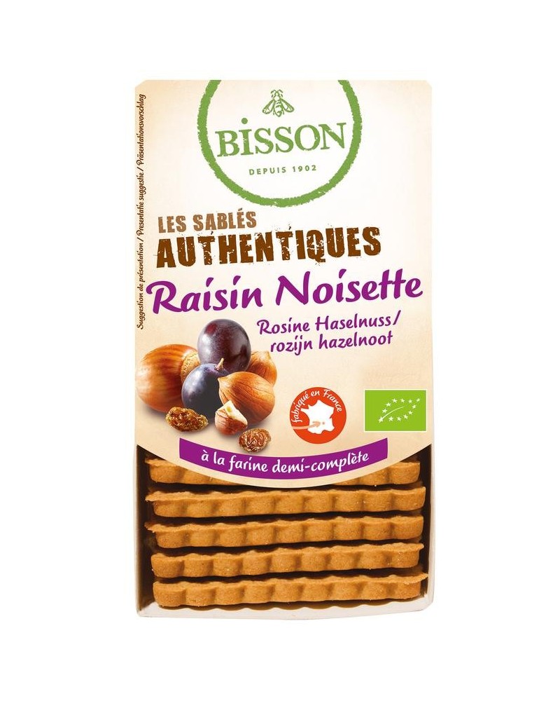 Authentieke zandkoekjes van Bisson met rozijnen en stukjes hazelnoot, gemaakt volgens authentieke recept. Biologisch, zonder palmolie en een bron van vezels.