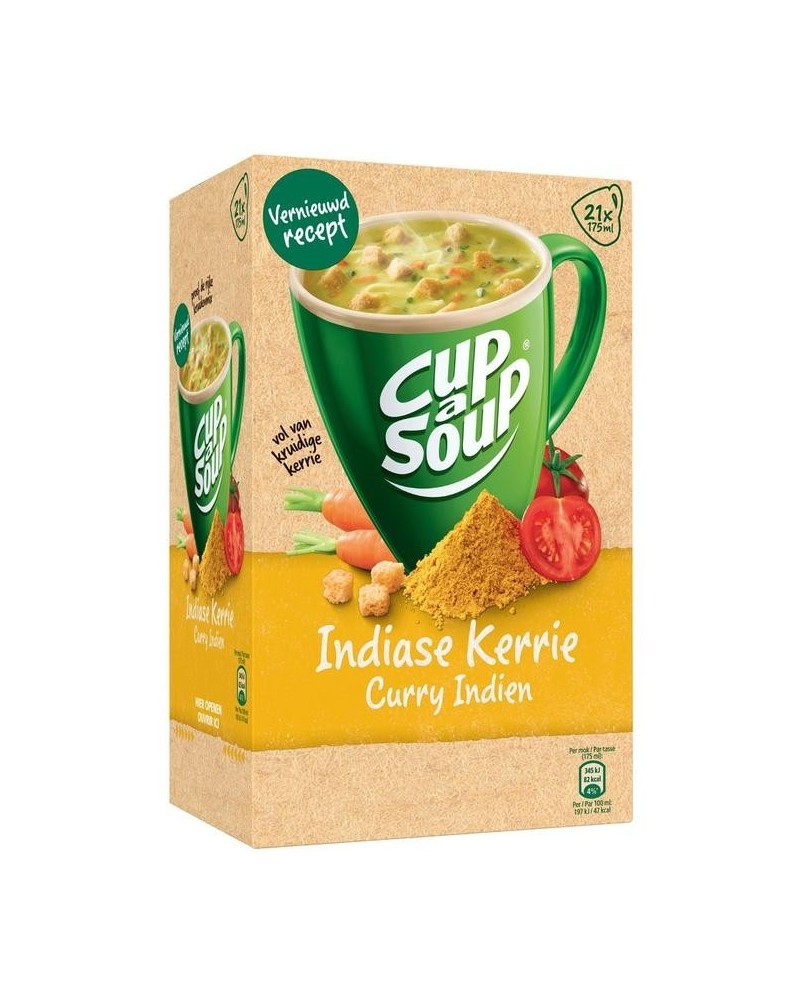 Aardappelzetmeel, Palmvet, Croutons 9,5% (witbrood (TARWEbloem, Zout, Gist, Raapzaadolie), Palmolie, Antioxidant: Rozemarijnextract), Dextrose, Appelpoeder, Groenten (Wortel 3,4%, Tomaat 1,4%, Ui), Gejodeerd zout, Deegwaar 4,8% (Harde TARWEgries, Zout), Kerrie 4,4% (Peper, Koriander, Komijnzaad, Cayennepeper, Lavas, Paprika, Knoflook, MOSTERDzaad, Karwij, Nootmuskaat, Ui), Suiker, Gistextract, Glucosestroop, Aroma (bevat EI), Mineraalzout (kalium), Zout, MELKeiwitten, Kippenvet (Kippenvet, Antioxidant: Rozemarijnextract), Specerijen (Knoflookpoeder, Kruidnagel, Nootmuskaat), Bieslook 0,2%.