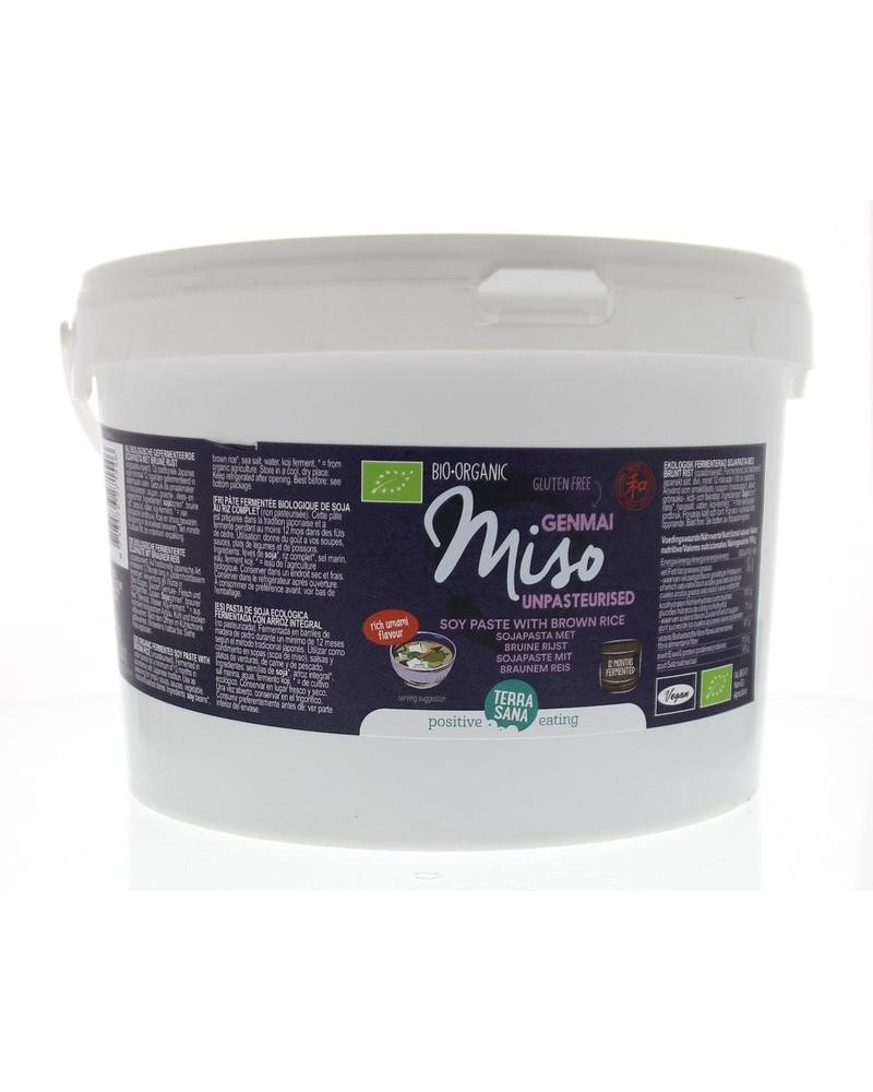 Genmai miso (ongepasteuriseerd) is een gemiddeld krachtige Japanse smaakmaker die op traditionele wijze gemaakt wordt van gefermenteerde sojabonen en ongepolijste bruine rijst. Fermentatieperiode: minimaal 12 maanden.
