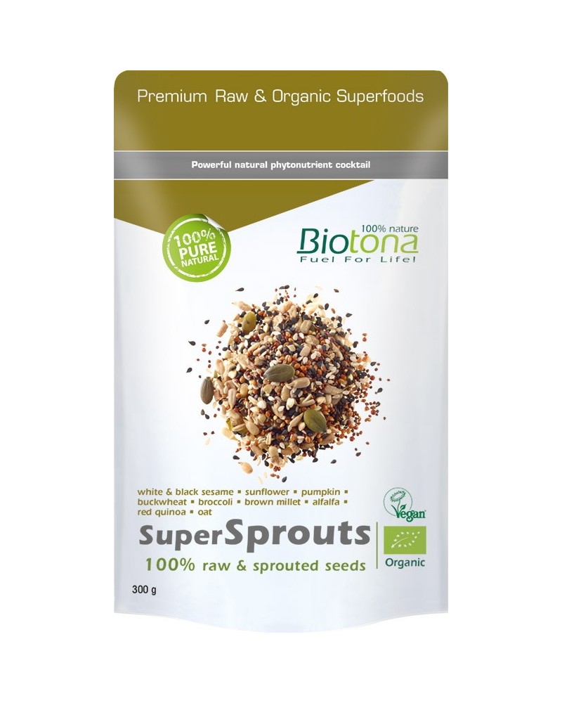 Biotona Bio SuperSprouts Raw is een superieur mengsel van gespruite biologische zaden van boekweit, broccoli, bruine gierst, haver, luzerne, pompoen, zonnebloem; rode quinoa, witte en zwarte sesam. Na grondig wassen laat men de zaden 1 à 2 dagen kiemen op schalen onder gecontroleerde omstandigheden. Het kiemen ontgrendelt de sluimerende levenskrachten in de zaden en brengt heel wat positieve eigenschappen met zich mee. Daarenboven zijn gespruite zaden veel vlotter verteerbaar. Na het spruiten worden de zaden nog 24 u gedroogd bij maximaal 42°C. Deze verwerking garandeert de hoogste kwaliteit, alsook het behoud van nutriënten en enzymen. Ze is niet te vergelijken met de standaard commerciële verwerking van zaden en granen waarbij gemakkelijk temperaturen tot 100°C worden bereikt. De biologische teelt en de specifieke verwerking resulteren in de smaakvolle en knapperige Biotona Supersprouts.