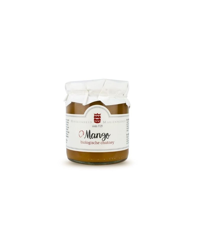 Mango* (68%), suiker*, uien*, rode paprika*, azijn*, geleermiddel (pectine), voedingszuur (citroenzuur), kruiden en specerijen*, zout, natuurlijk peperextract.