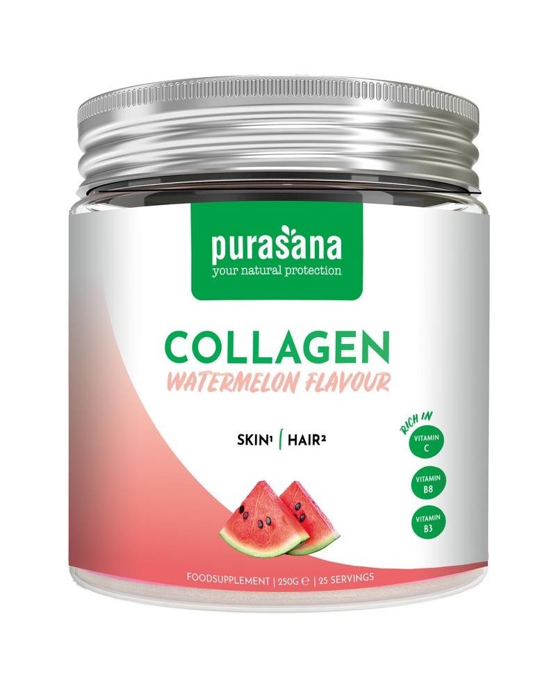 Gehydroliseerde collageen peptides, watermeloenpoeder (Citrus lanatus), appelpoeder (Malus domestica), sinaasappelpoeder (Citrus sinensis), vulmiddel (maltodextrine), natuurlijk aroma, vitamine C (ascorbinezuur), zuurteregelaar (citroenzuur), natuurlijke kleurstof (rode biet en beta caroteen), zoetstof (sucralose), vitamine B3 (niacine), vitamine B8 (biotine).