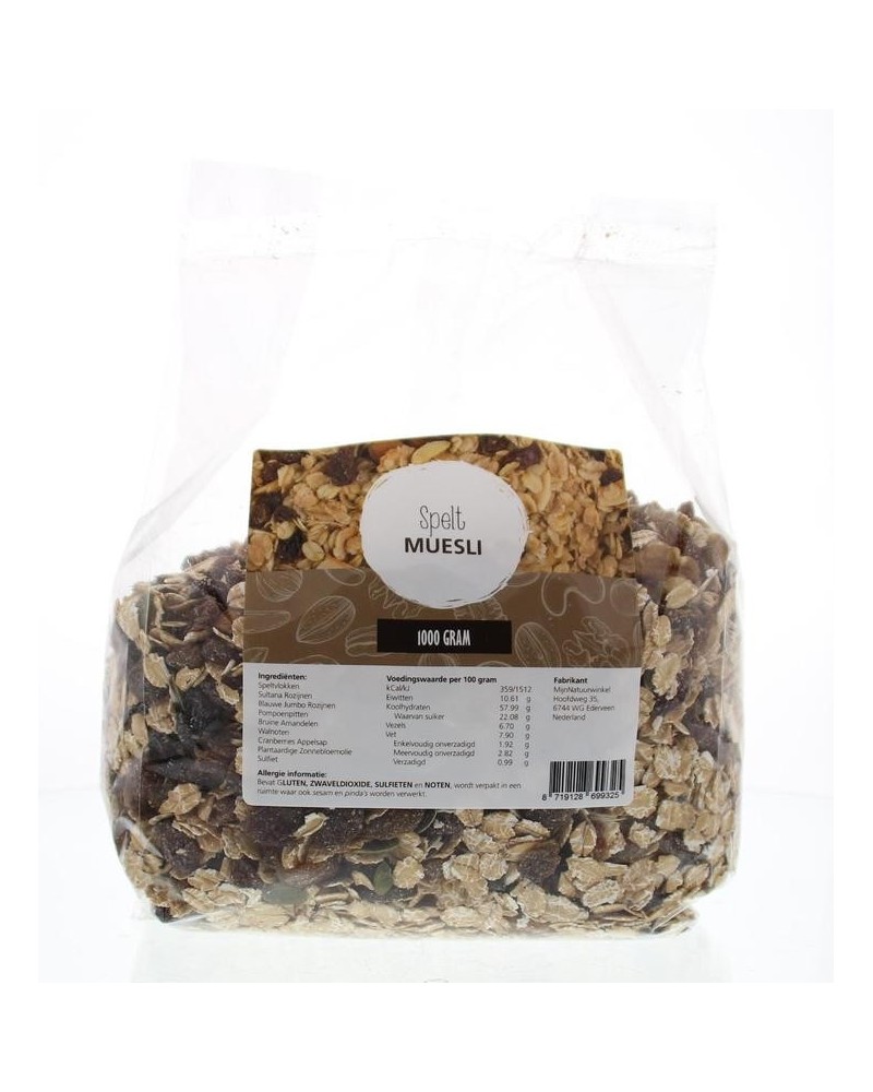 SPELTVLOKKEN (TARWE), sultana rozijnen, blauwe jumbo rozijnen, pompoenpitten, bruine AMANDELEN (noten), WALNOTEN, cranberries appelsap, plantaardige zonnebloemolie, SULFIET