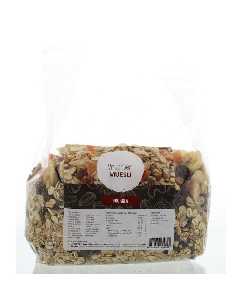 TARWE vlokken, GERST vlokken, HAVER vlokken, Ananas blokjes, Blauwe jumbo rozijnen, Bananen chips, Papaya blokjes, Pompoenpitten, Zonnebloempitten, Ananas ringen, Cranberries met rietsuiker, Aardbeien, Rietsuiker, Voedingszuur: E330, SULFIET, Aroma (aardbei), Zwarte wortel concentraat (kleurstof)
