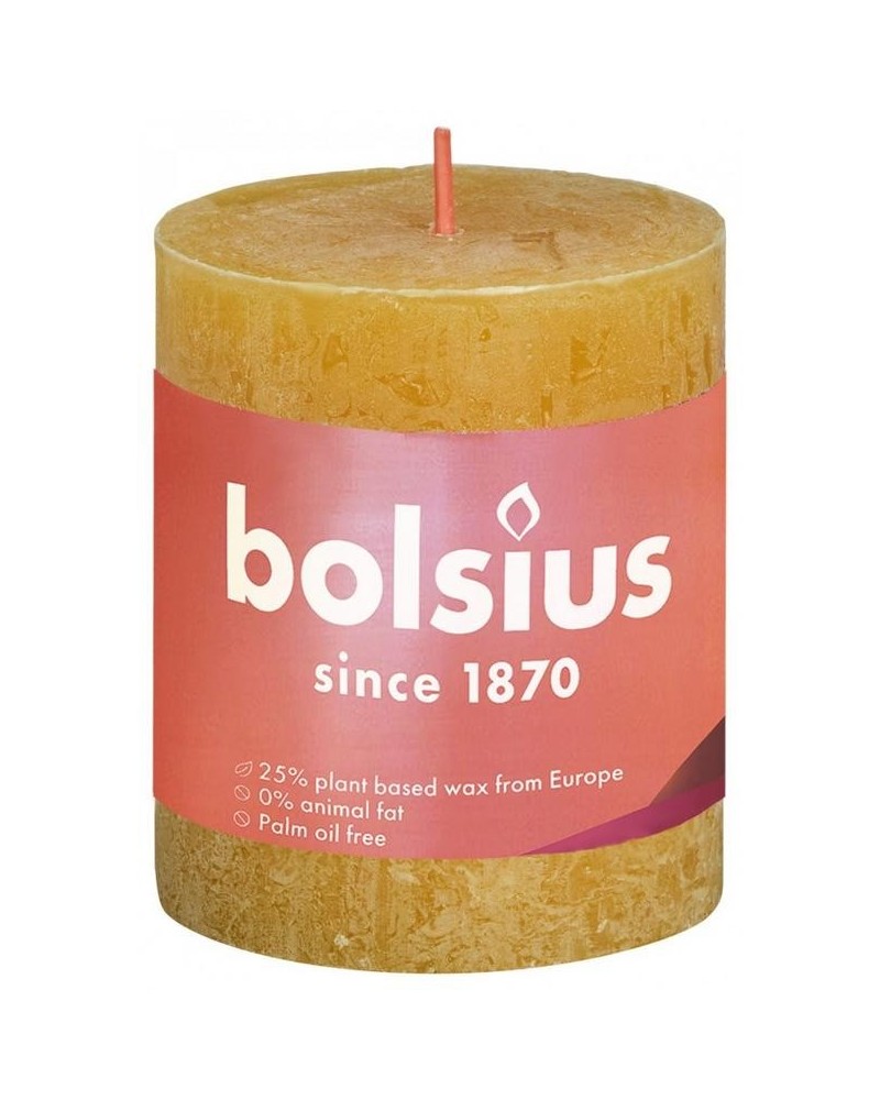 De Bolsius rustieke stompkaars in de okergele kleur Honeycomb Yellow is 8cm hoog en brandt wel 35 uur.