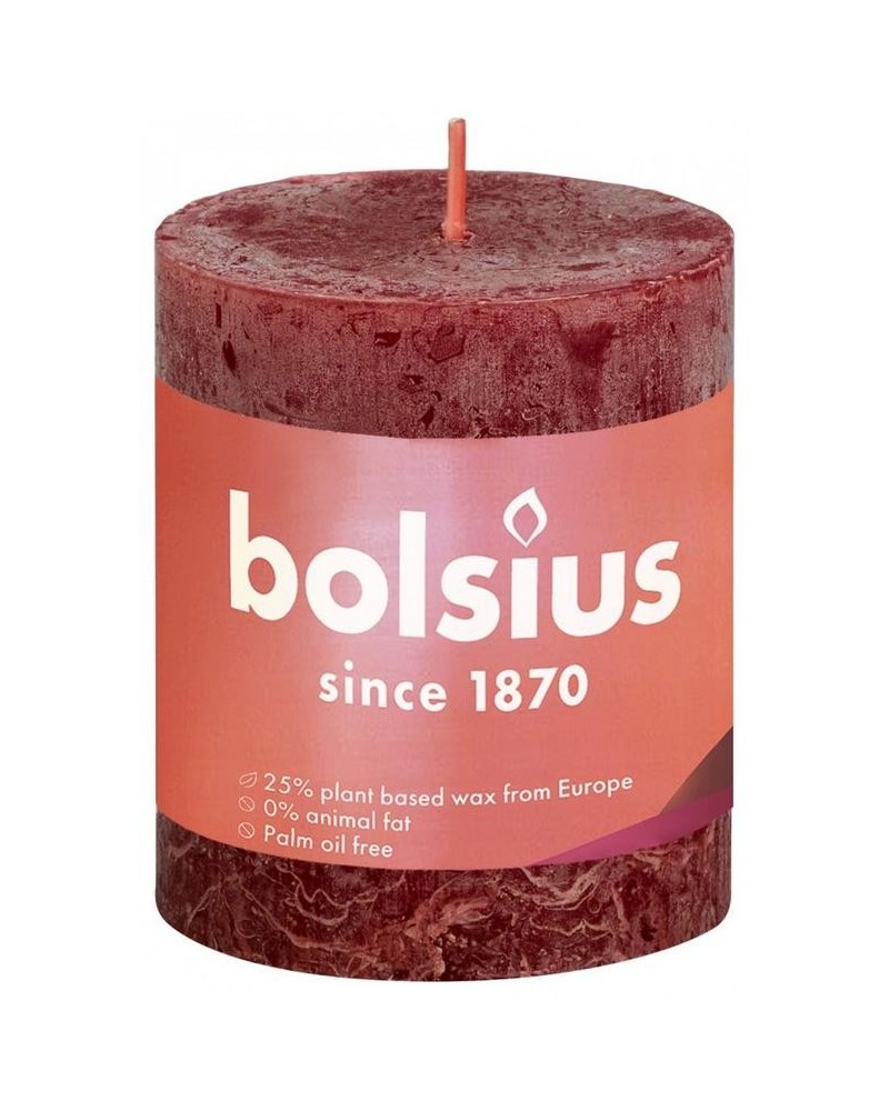 De Bolsius rustieke stompkaars in de bordeauxrode kleur Velvet Red is 8cm hoog en brandt wel 35 uur.