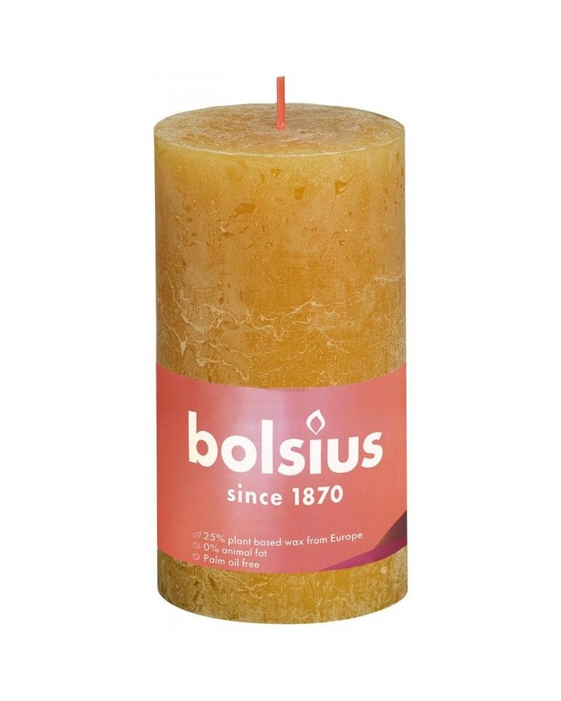 De Bolsius rustieke stompkaars in de okergele kleur Honeycomb Yellow is 13cm hoog en brandt wel 60 uur.