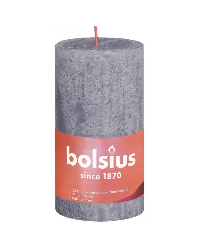 De Bolsius rustieke stompkaars in de blauwe kleur Frosted Lavender is 13cm hoog en brandt wel 60 uur.
