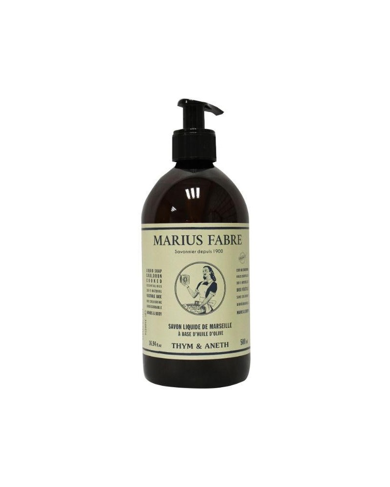 Nature Zeep tijm dille van Marius Fabre is een vloeibare Marseille zeep. De zeep wordt op de traditionele ambachtelijke wijze “la méthode traditionnelle marseillaise” in ketels gekookt. Daar vindt het verzepingsproces plaats. De basis van deze vloeibare zepen is olijfolie, bekend om zijn hydraterende eigenschappen. De Savon liquide Nature worden geparfumeerd met natuurlijke essentiële oliën.