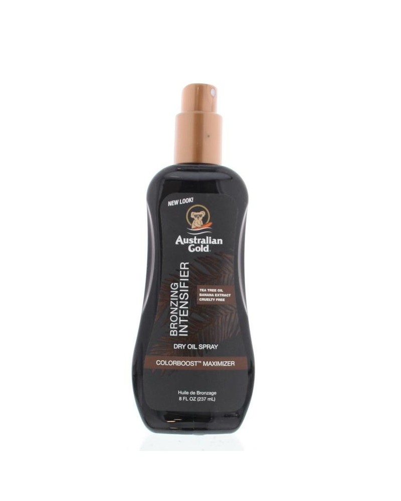 Let op! Bij de Australian Gold 'Dry Oil Spray' zit er geen factor in, dus alleen voor ervaren bruiners. Maar je wordt er wel heel snel heel diepdonker bruin van, dankzij o.a. de 'Colorboost Tan Maximize' formule, de natuurlijke bronzers, carrot seed olie, banaanextracten, zwarte walnootextracten, annatto olie en Australische Tea Tree olie. Aloë Vera, vitamine E, Panthenol en zonnebloemzaad olie verzorgen je huid uitstekend. Sprayflacons 237 ml.