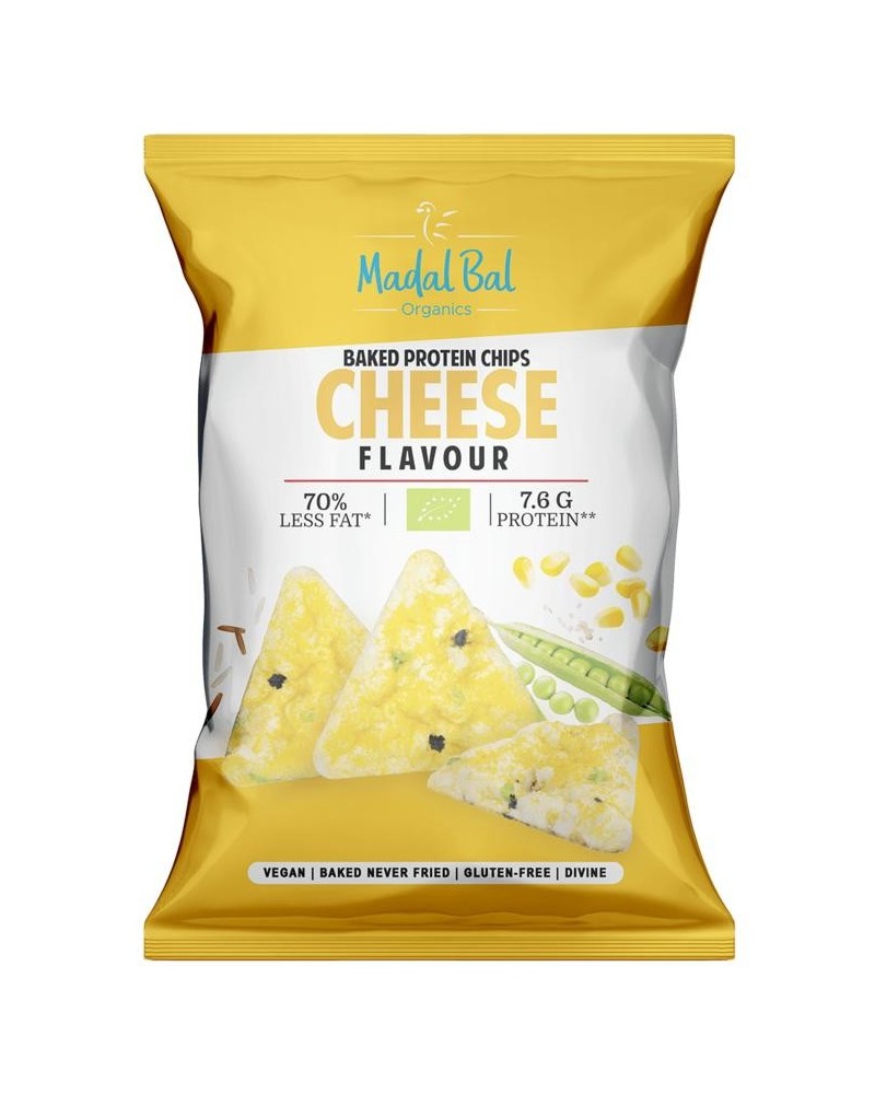 Biologische ovengebakken meergranen chips met erwten-eiwit en kaas-uien smaak.